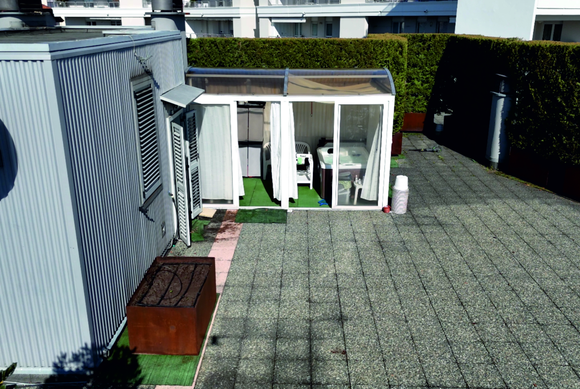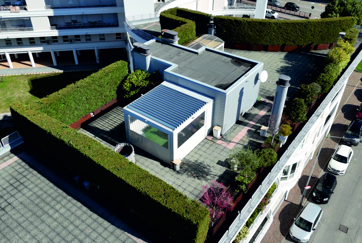 Il terrazzo è dotato di due dehors, uno ospita una vasca idromassaggio per due persone, mentre l’altro è un dehors bioclimatico con aperture laterali e superiore automatizzate.