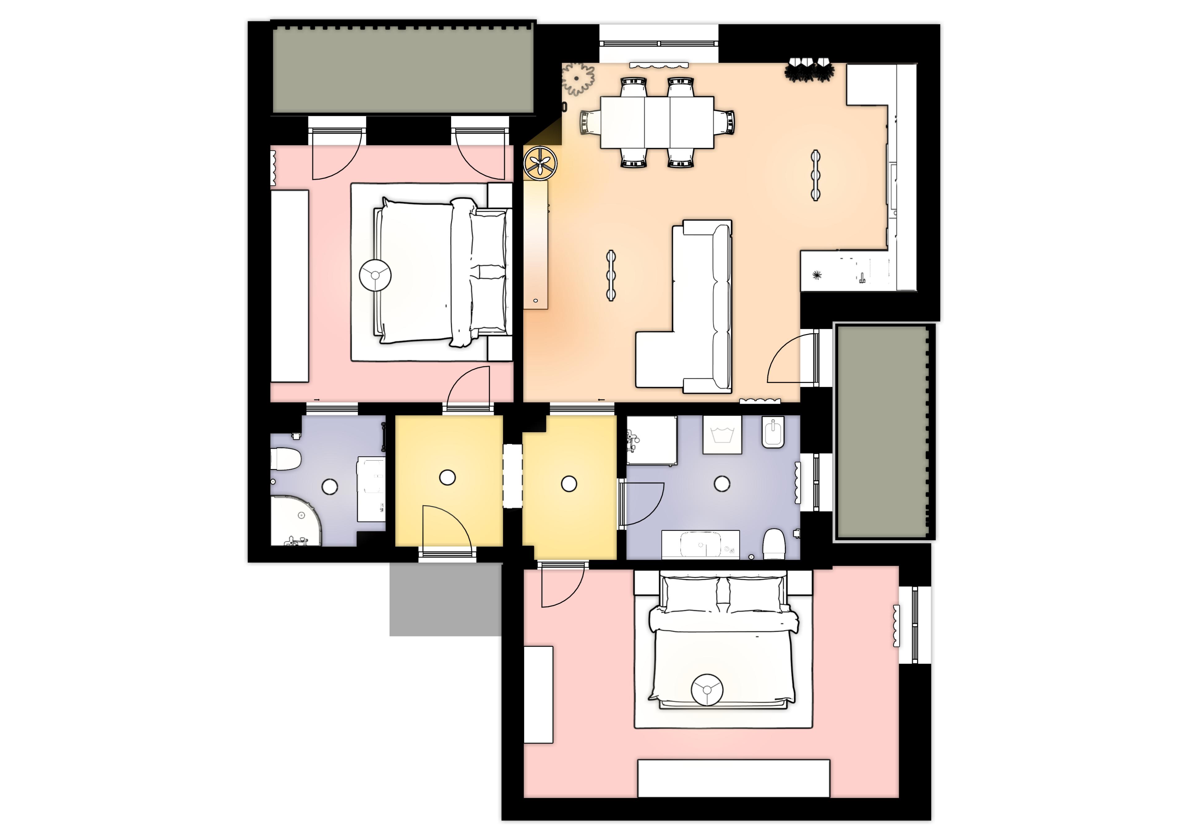 L’alloggio si trova al quinto piano con ascensore in Via Falletti 26. L’immobile misura 84 mq ed è composto da ingresso su soggiorno e cucina disposti in open space, due camere da letto, due bagni e due balconi. A completare l’abitazione una cantina.