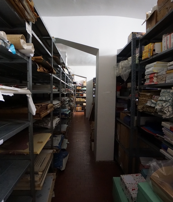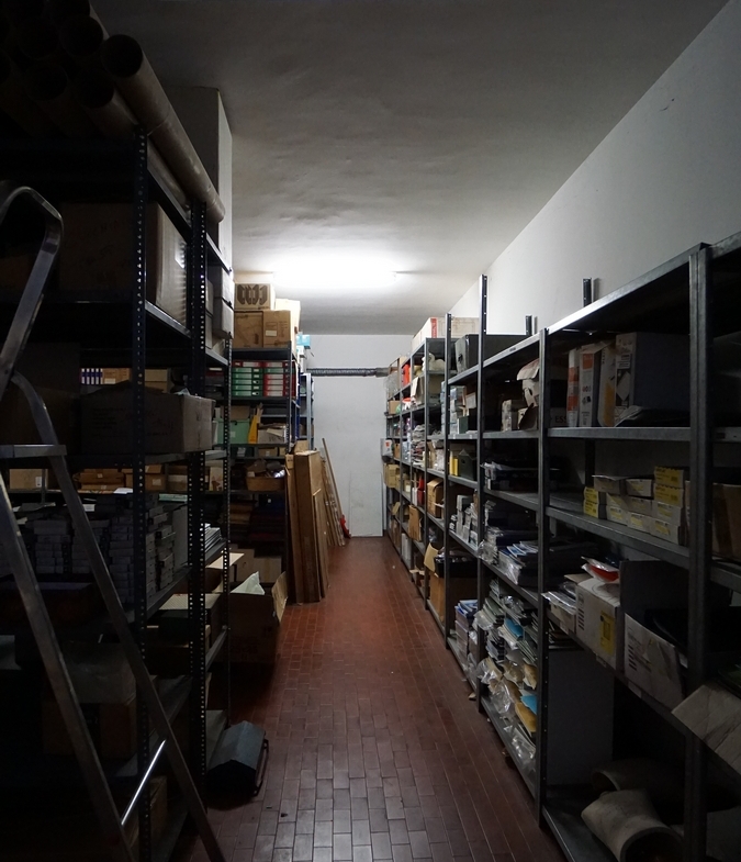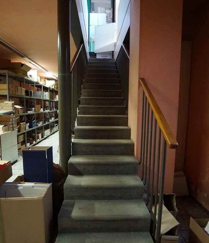 Dalla scala interna si scende al piano interrato dove si trova un ampio magazzino finestrato e con servizio igienico di circa 230 mq (altezza circa 3,25 m). Questo magazzino ha anche l’accesso da Via Trento n. 2 tramite cancello automatico.