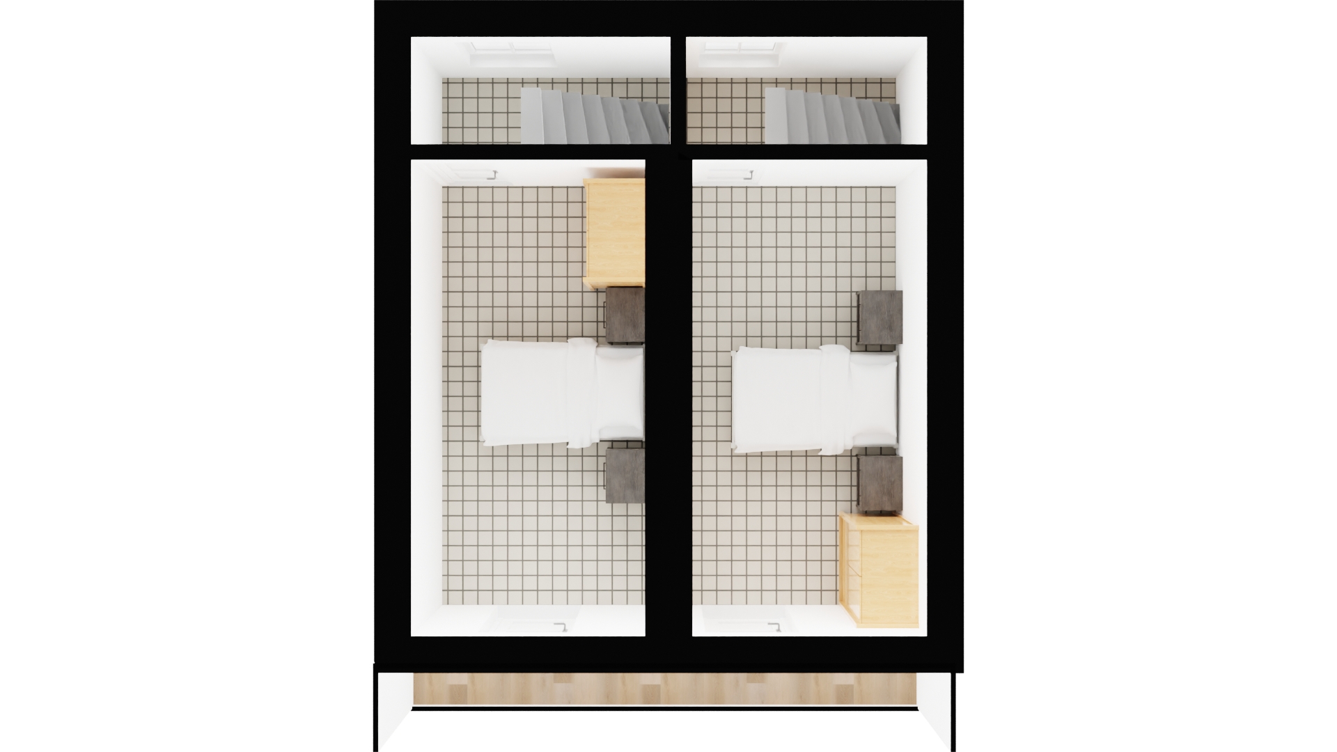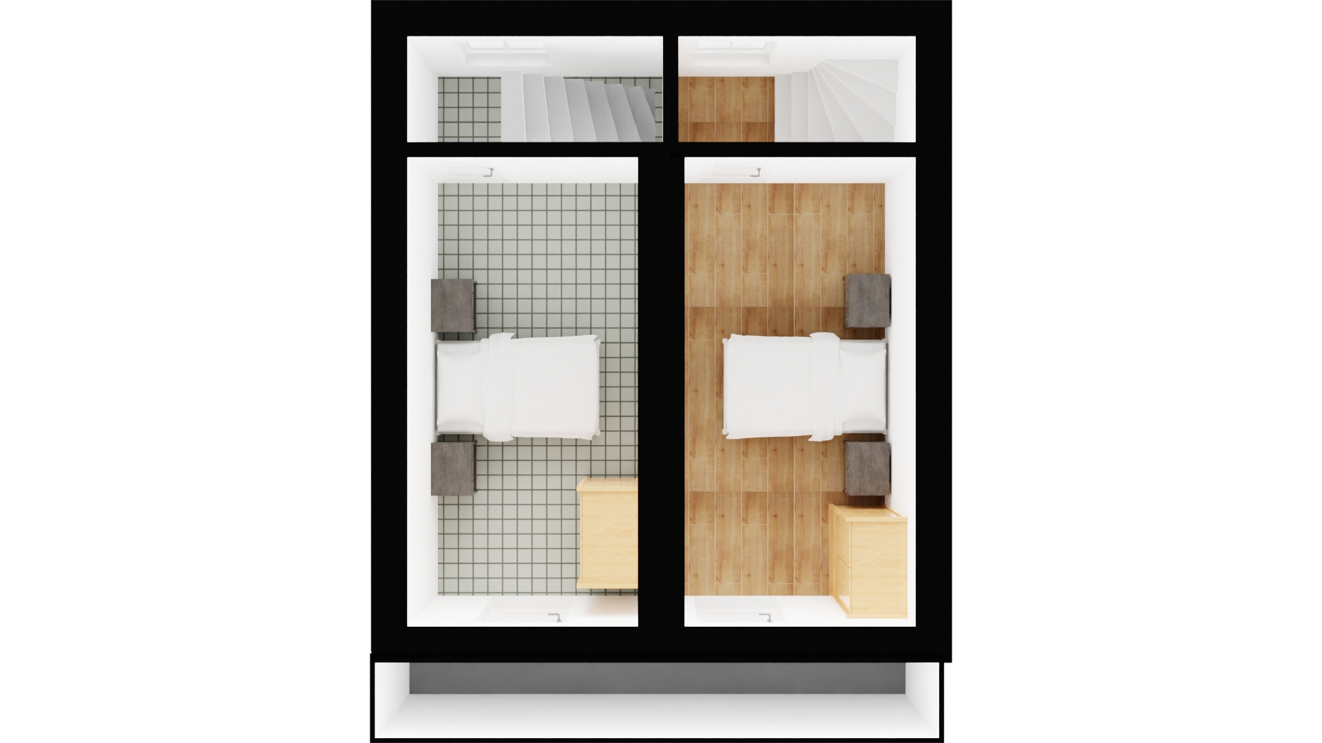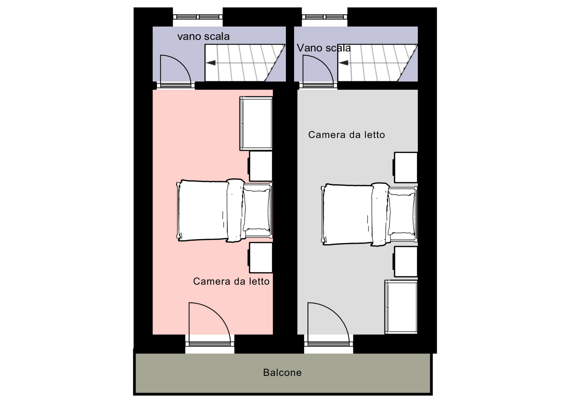 Salendo al primo piano troviamo le prime due camere da letto, entrambe con accesso al balcone. L’ultimo livello, gemello del primo piano, è composto da altre due camere da letto, sempre con accesso al balcone.