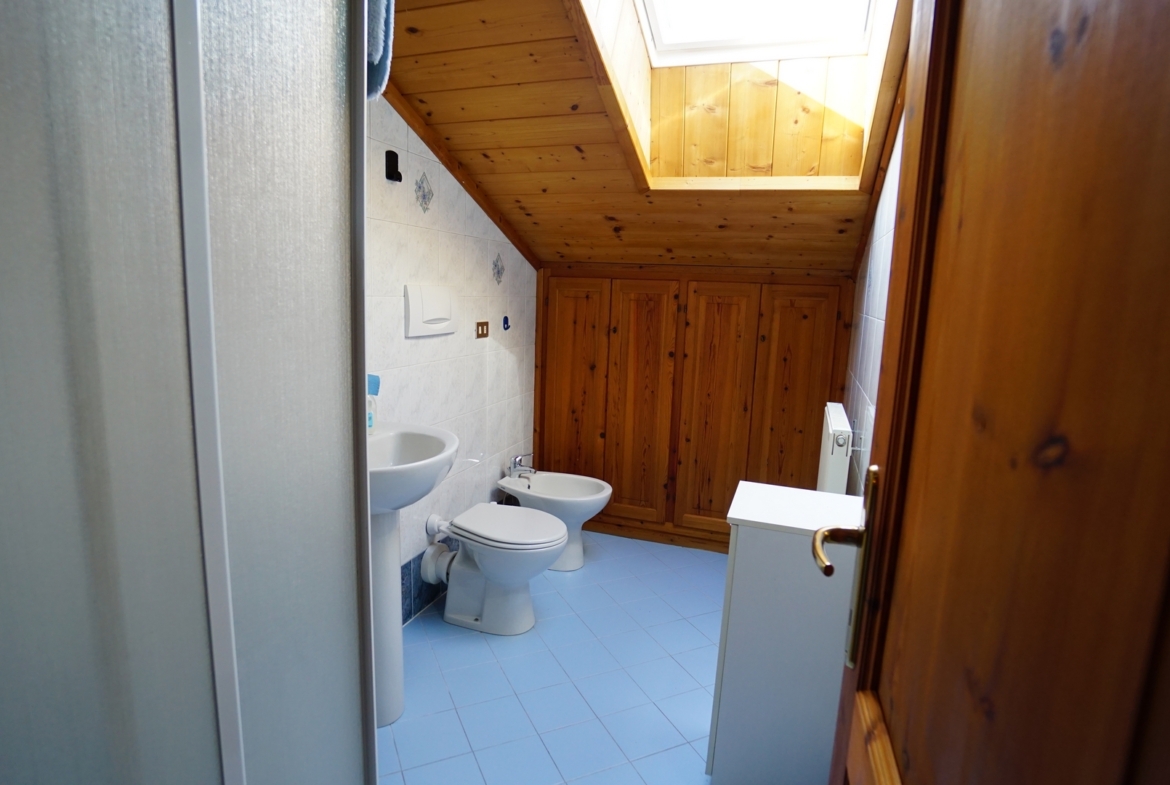 Il bagno e la grande camera da letto matrimoniale, entrambi rifiniti con armadiature a parete, completano la mansarda.